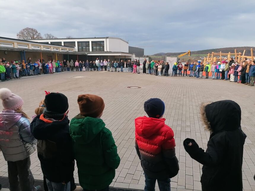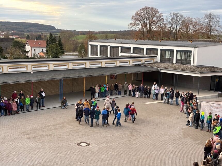 Zum Start in die Weihnachtsferien hat sich die gesamte Schulgemeinde in der 2. Stunde auf dem Schulhof versammelt – alle Schülerinnen und Schüler auf einem Haufen, das passiert nicht alle Tage 😊