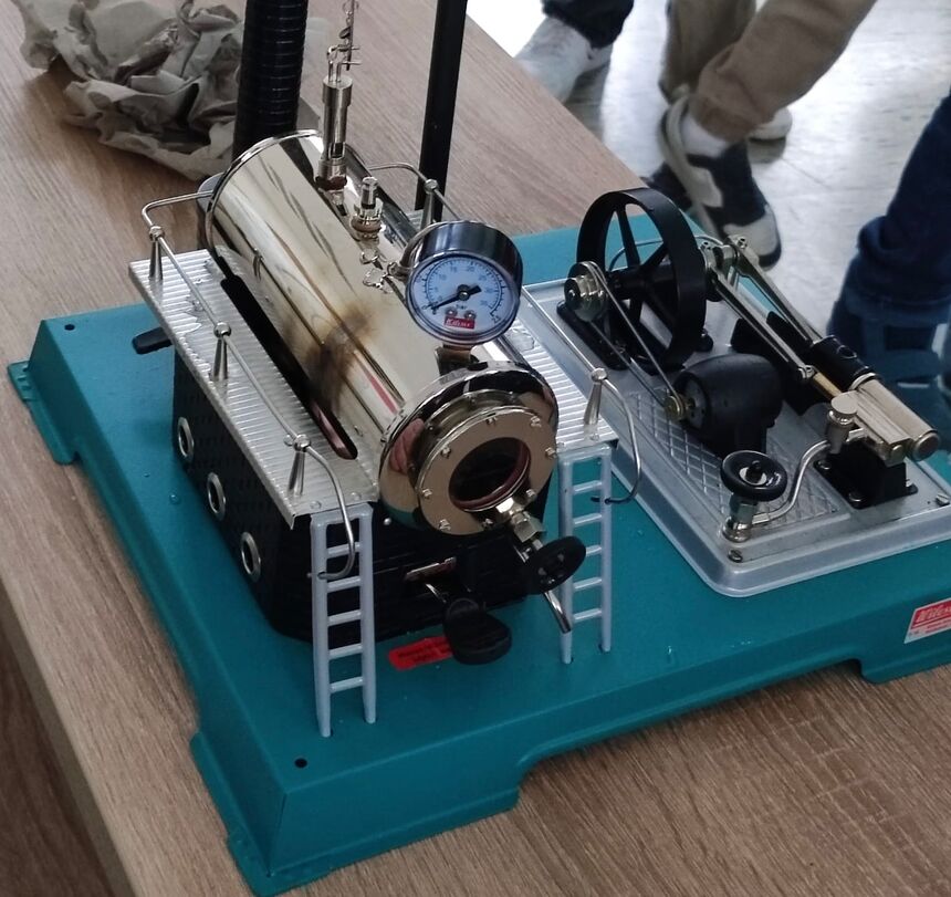 Dann kam das große Highlight der Stunde: die Dampfmaschine! Der Kessel wurde mit Wasser gefüllt, darunter ein Grillanzünder gelegt (die Lehrerin hoffte leise, dass der Feuermelder heute einen Ruhetag hat 😉). Der Druck stieg, der Generator sprang an – und tatsächlich begann die kleine Straßenlaterne zu leuchten. Zum grandiosen Finale durfte jedes Kind an der kleinen Kette ziehen, um den Dampf abzulassen. Ein kräftiger Pfiff wie bei einer echten Dampflok! 🚂